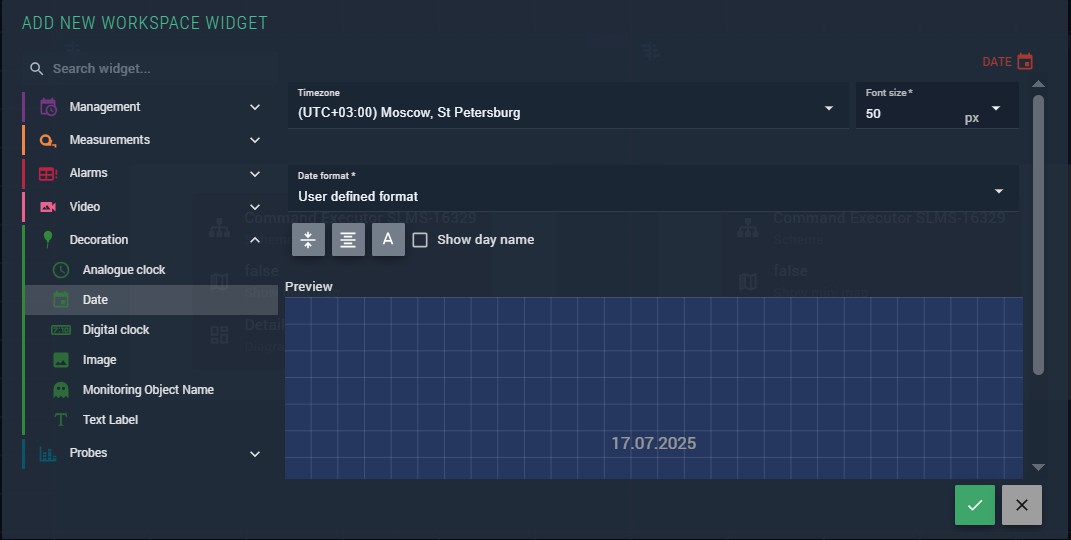 Decoration widgets add informational and visual elements to workspaces and layouts — clocks, date displays, labels, images, and object name indicators. These widgets are useful for building polished, self-explanatory monitoring dashboards.