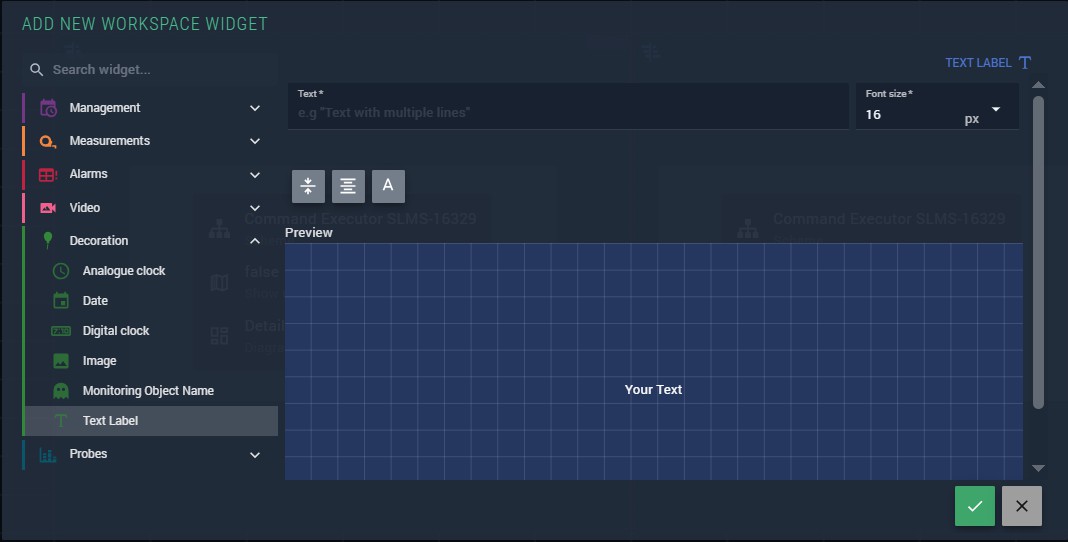 The Text label widget displays a static, user-defined text string in the workspace. It can be used for headings, section dividers, notes, or any other fixed text annotation. Users can customize the font size, font color, and text alignment.