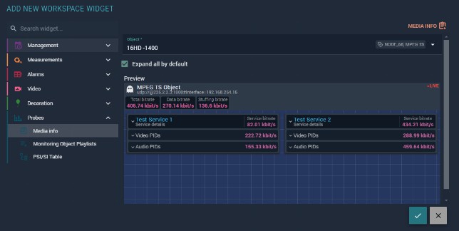 Probes widgets provide deep technical readouts from monitoring objects — stream structure, PSI/SI tables, playlist contents, and detailed bitrate breakdowns. These widgets are intended for diagnostic and engineering use.