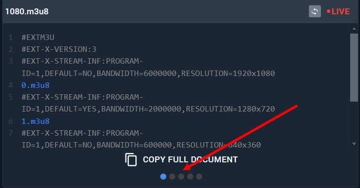 To copy the full playlist document to the clipboard, click the Copy full document button. To switch between individual playlists (master and media variants), use the navigation buttons indicated by the red arrow in the visualization.