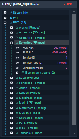 The PSI/SI table widget displays the Program Specific Information and Service Information (PSI/SI) tables of an MPEG TS monitoring object in an expandable tree format. This provides a complete view of the stream's logical structure as defined in the transport stream descriptors.