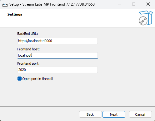 http://localhost:40000(change this if Backend was installed on a different server) - FrontEnd host — default: