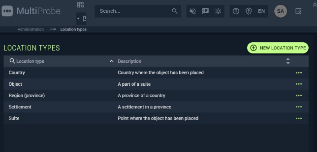 To manage location types, go to Administration → Structure → Location types. Click New location type and enter a name and description.