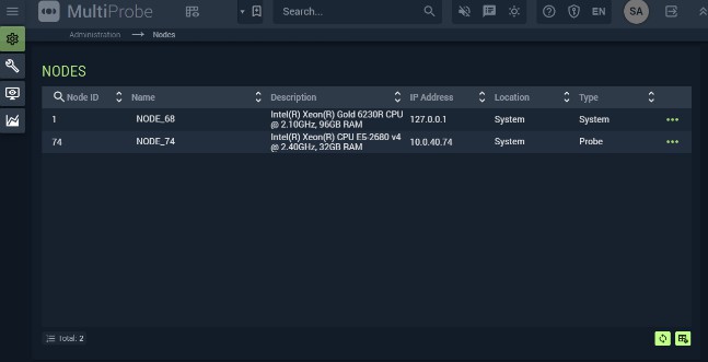 Nodes cannot be created manually from the UI — they are registered automatically during MultiProbe installation. If a node is not visible in the list, verify its network availability from the Central Server (see Section 2.7).
