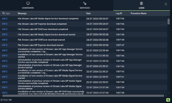Logs — the system event log, showing time, content, and procedure name for each entry. Covers significant events such as component installation, service startup, and faults.