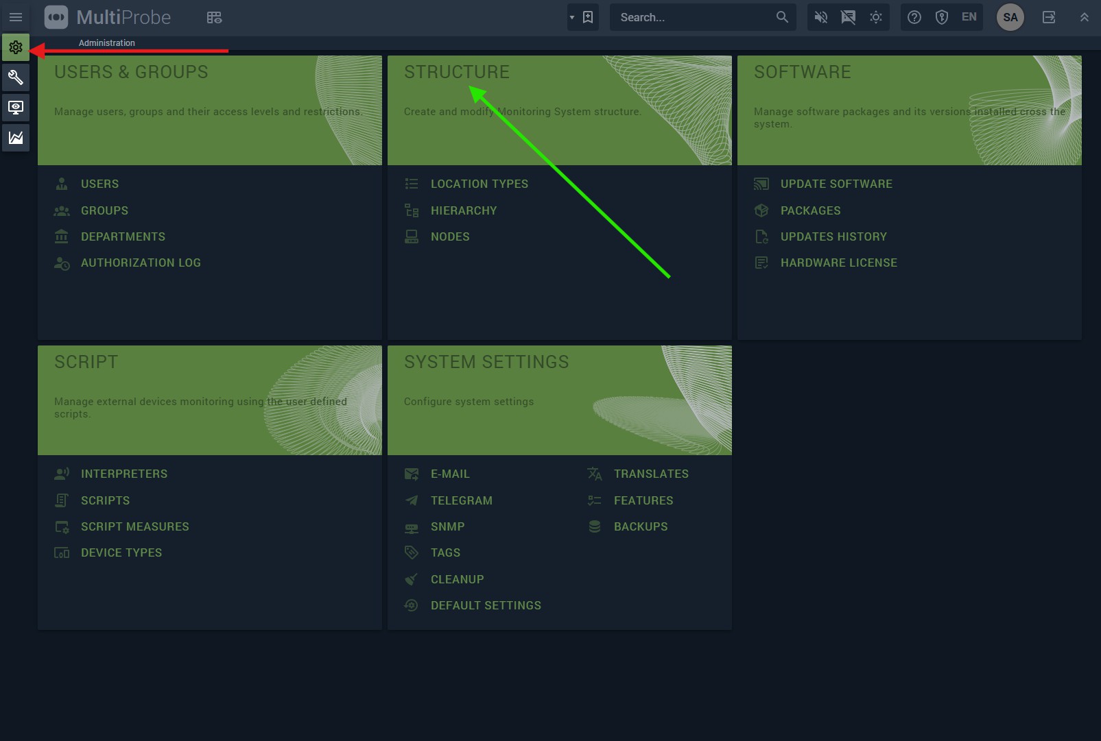 Structure configuration is done in Administration → Structure, which contains three screens: Location types, Hierarchy, and Nodes.