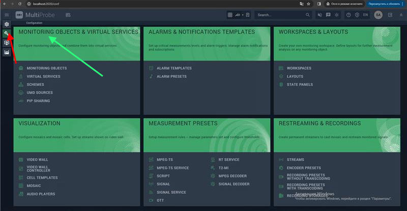 To manage monitoring objects, open the Configuration screen and select Monitoring objects & virtual services.
