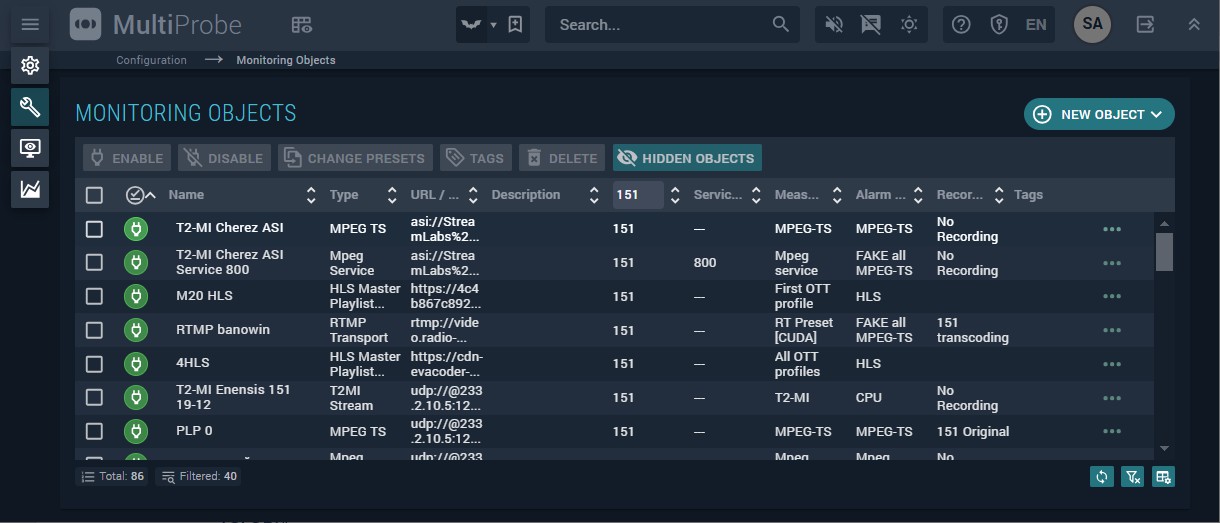 - Disable — deactivate monitoring. Disabled objects are hidden from the list unless Hidden objects is toggled on.