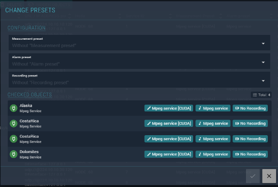 In the Configuration section, choose the presets to apply. The Checked objects section shows the currently selected objects and their existing presets. After selecting new presets, save — the changes will be applied and reflected in the object list.