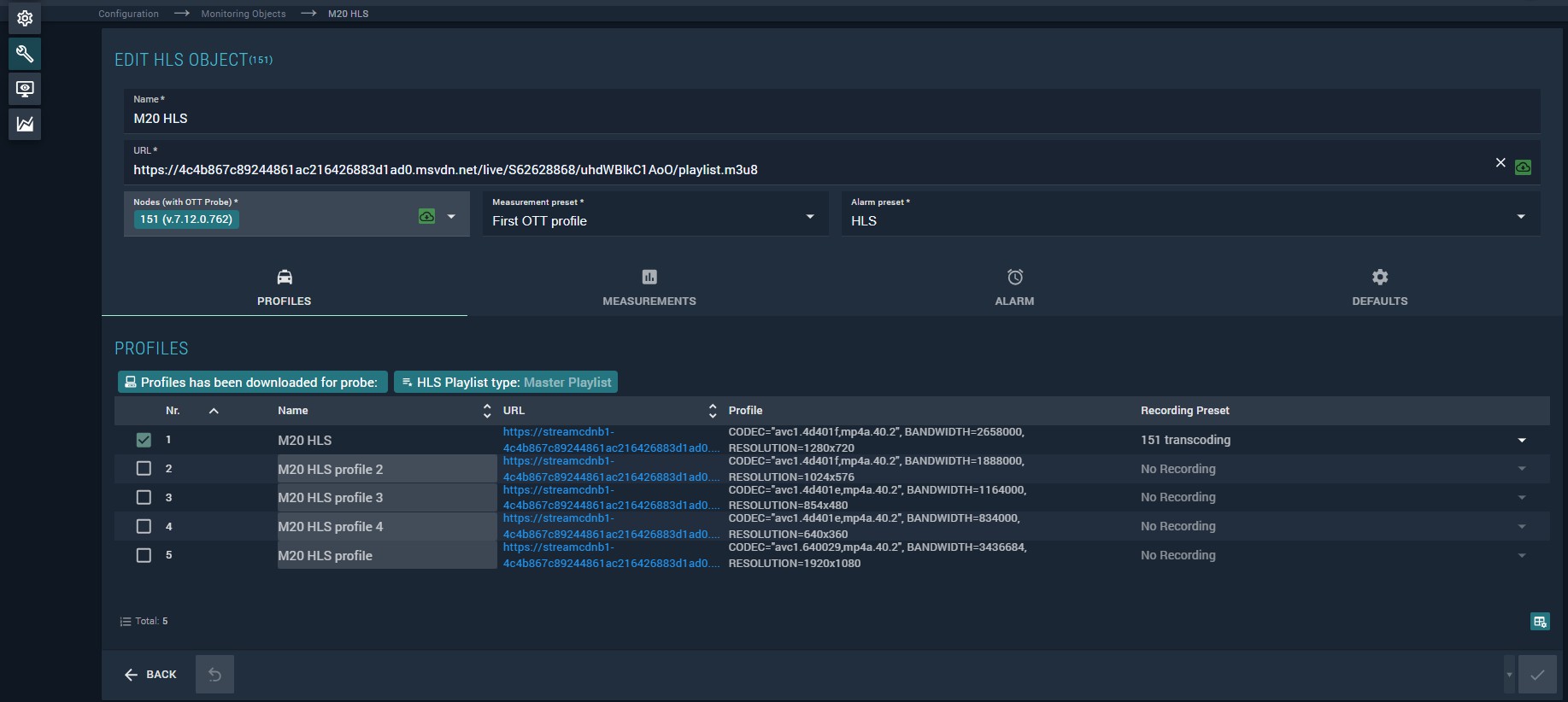 Profiles — lists profiles loaded from the HLS source. Profile parameters are read-only except for the recording preset, which allows selective recording of specific profiles. Each profile entry shows: