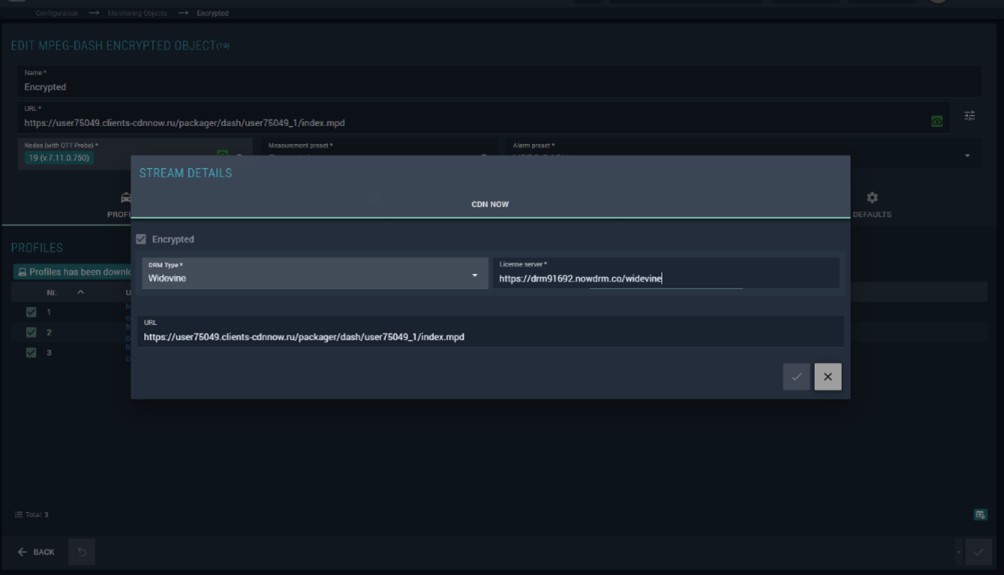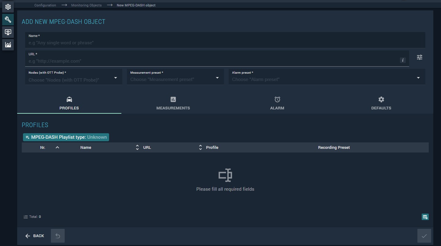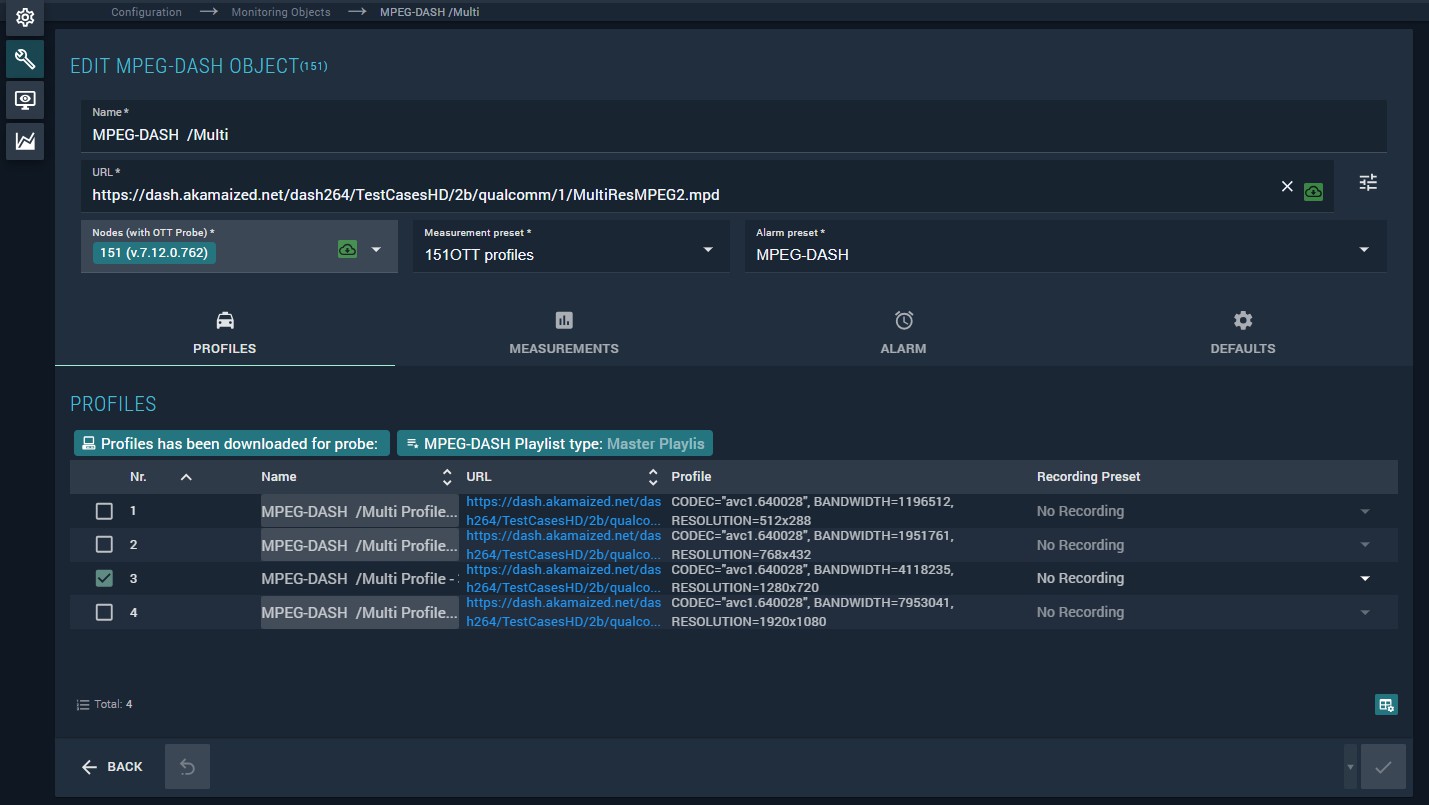 The MPEG-DASH monitoring object is used to monitor OTT streams compliant with the MPEG-DASH specification (ISO/IEC 23009).