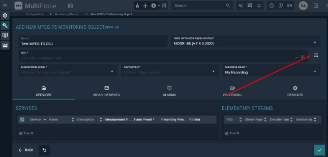 The configuration window opens when you create a new object or select an existing one for editing. Its appearance varies by object type. The example below shows the configuration window for an MPEG TS service type object.