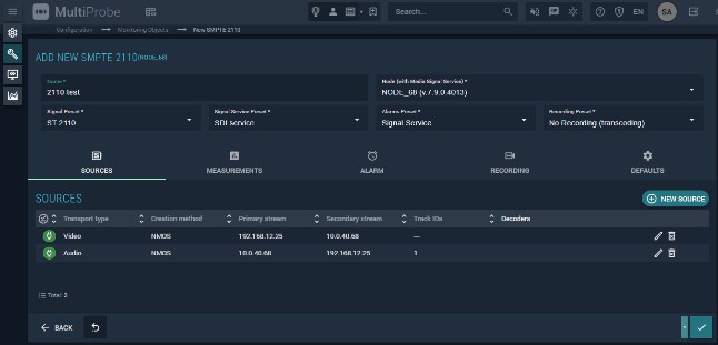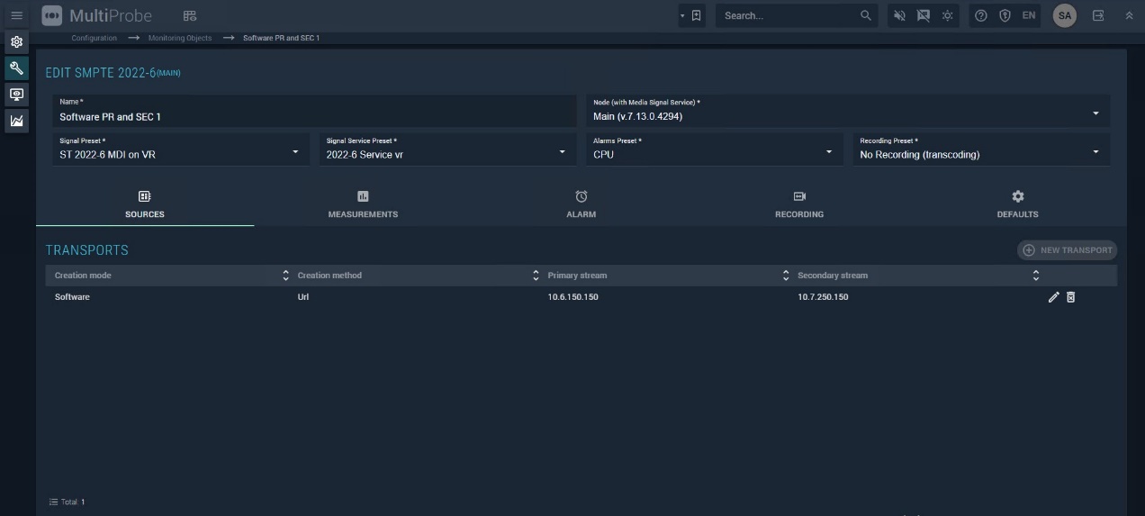 Sources — lists multicast streams containing signal components. To add a source, click NEW TRANSPORT. This opens the source addition window (Figure 96).