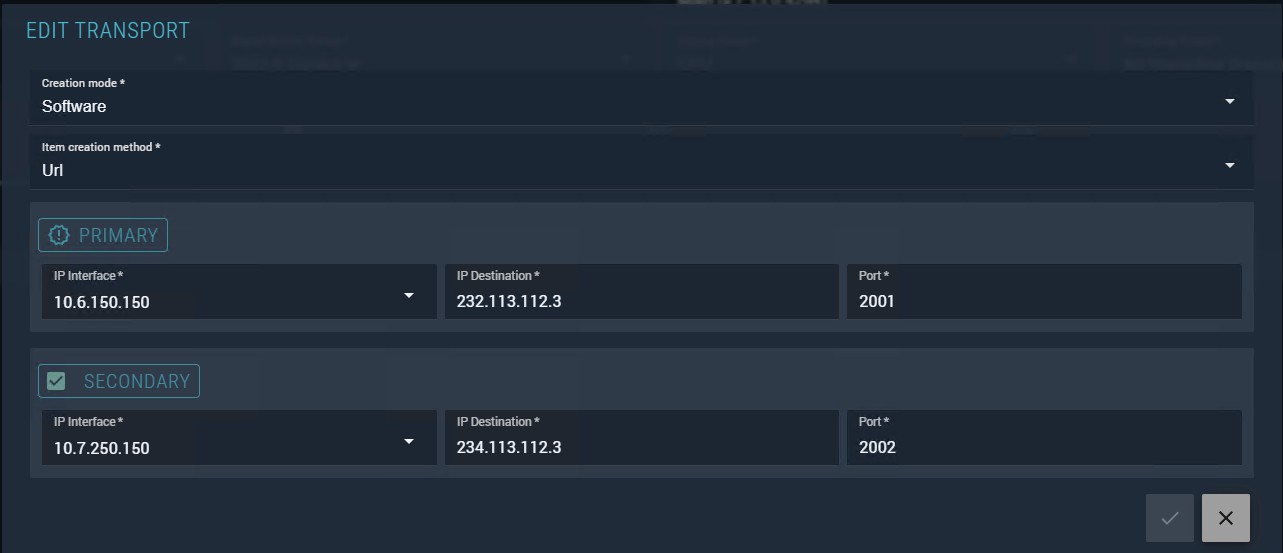 | Secondary stream | Node IP interface for the redundant stream; shown when Enable secondary stream is selected |