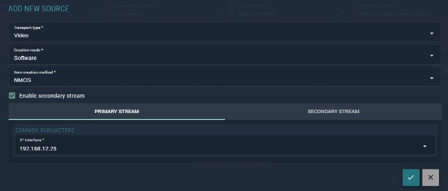 | Item creation method | URL — specify interface IP and SDP URL; NMOS — retrieve parameters from an NMOS server |