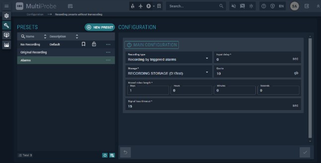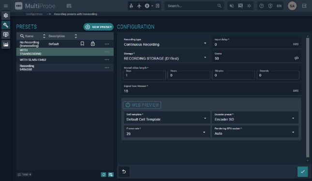 Recording without transcoding preserves the original signal quality in full, since no re-encoding is applied. Users create these presets and apply them during monitoring object configuration.