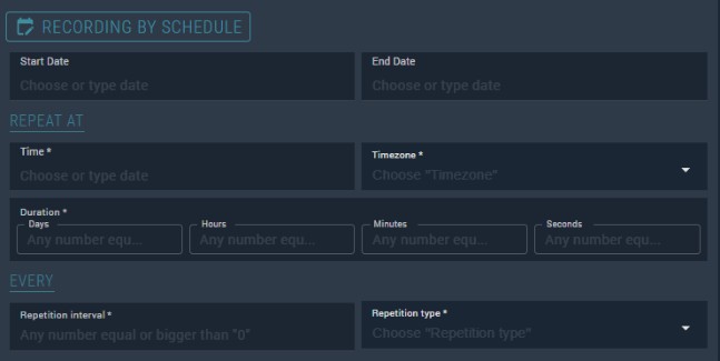 | Recording by schedule | Starts and stops per a user-defined schedule |