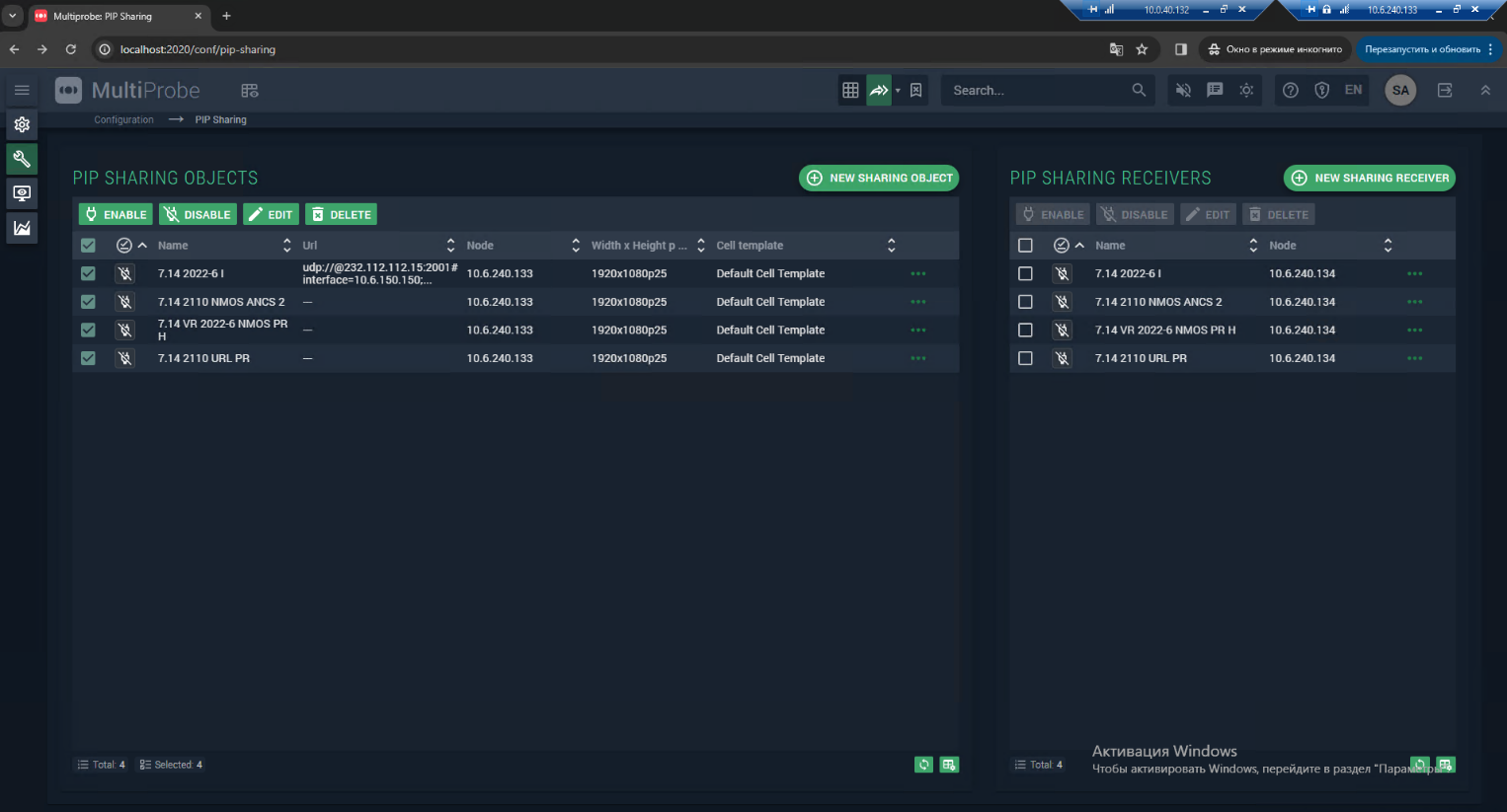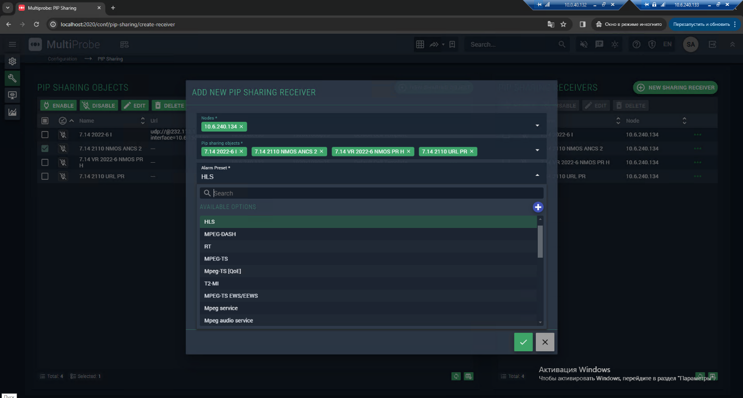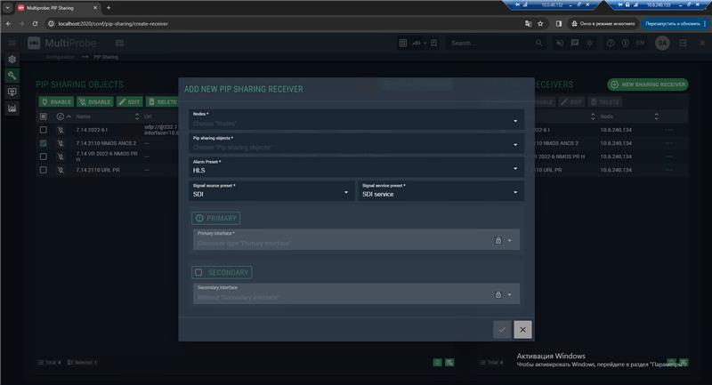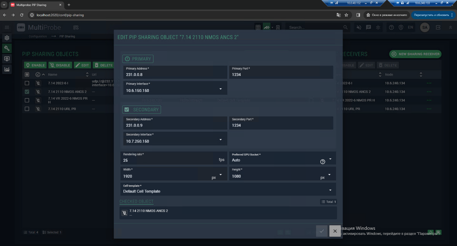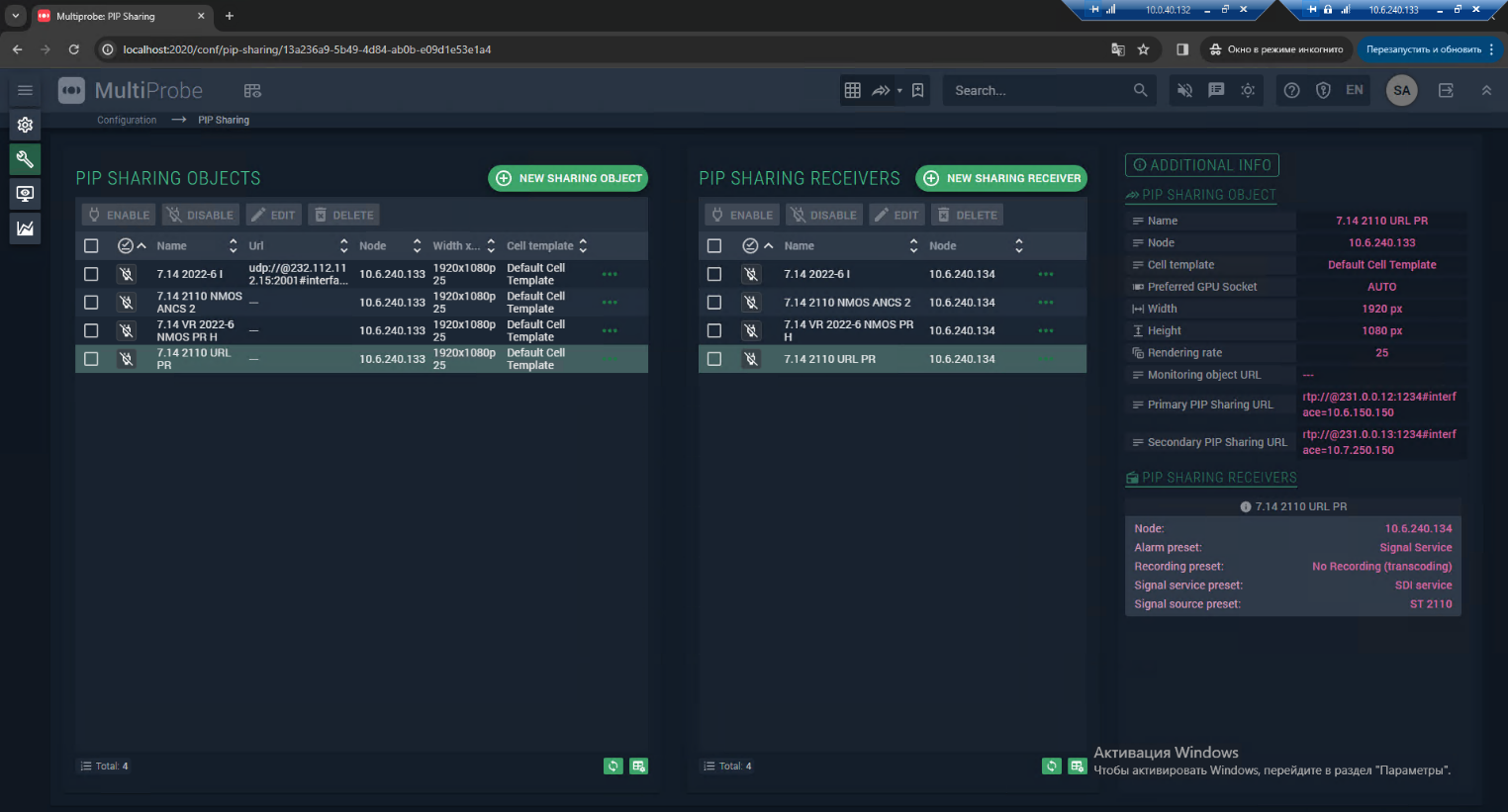 Figure 178. PIP Sharing service configuration window with information about the selected PIP Sharing monitoring object and PIP Sharing receiver