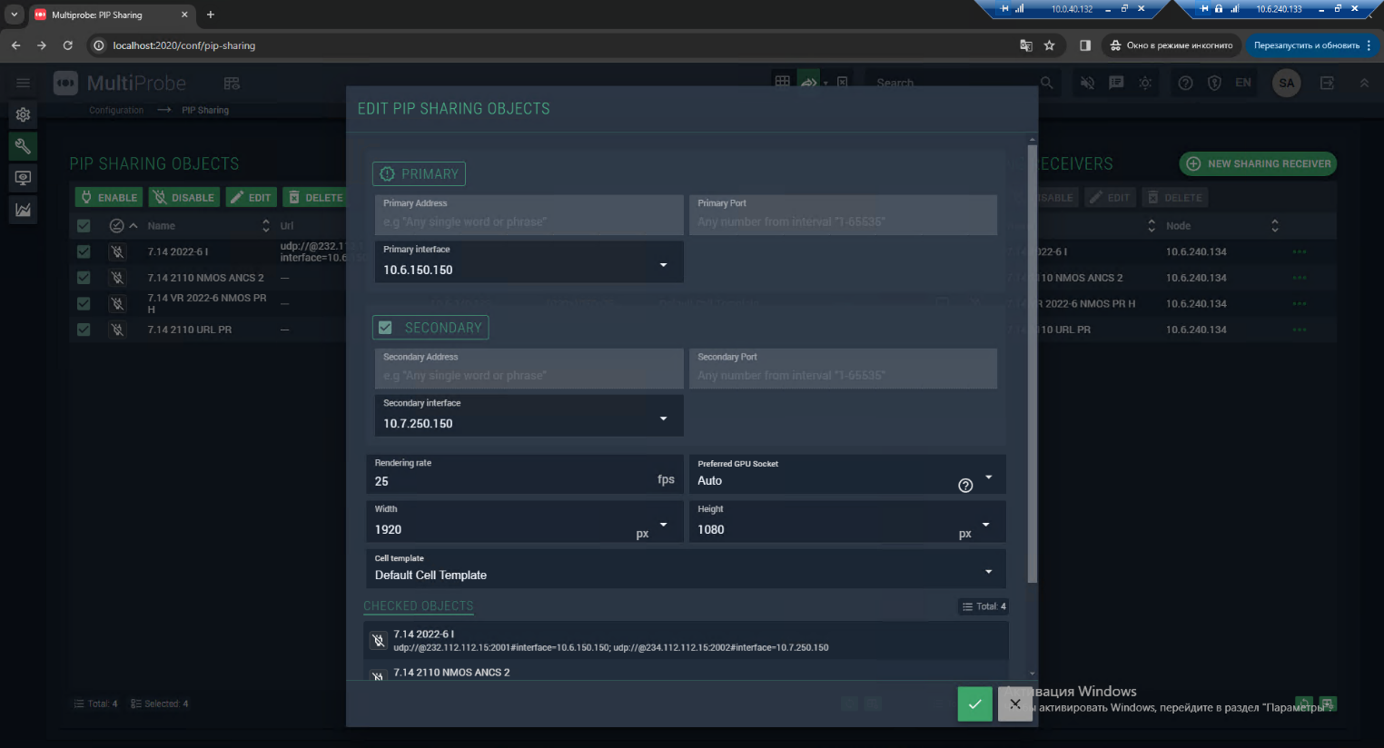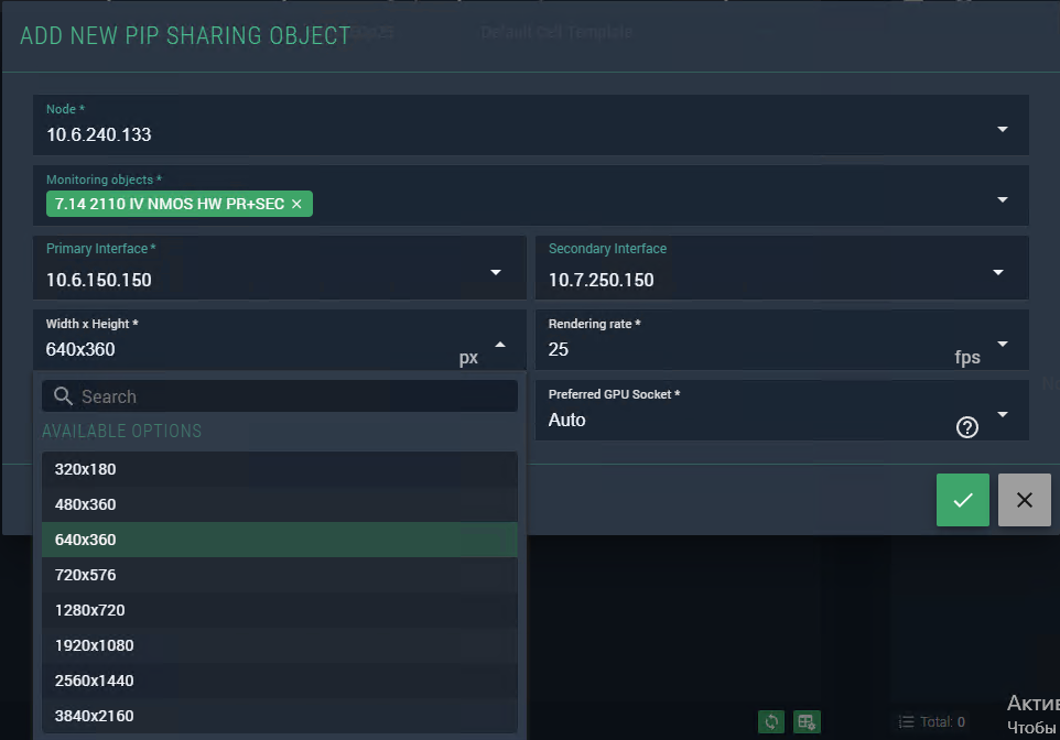 rtp://@224.1.1.1:5005#interface=127.0.0.x. - «Width»×«Height»p«Rendering rate» — the rendering settings: video width × video height at the specified frame rate used for PIP Sharing rendering.