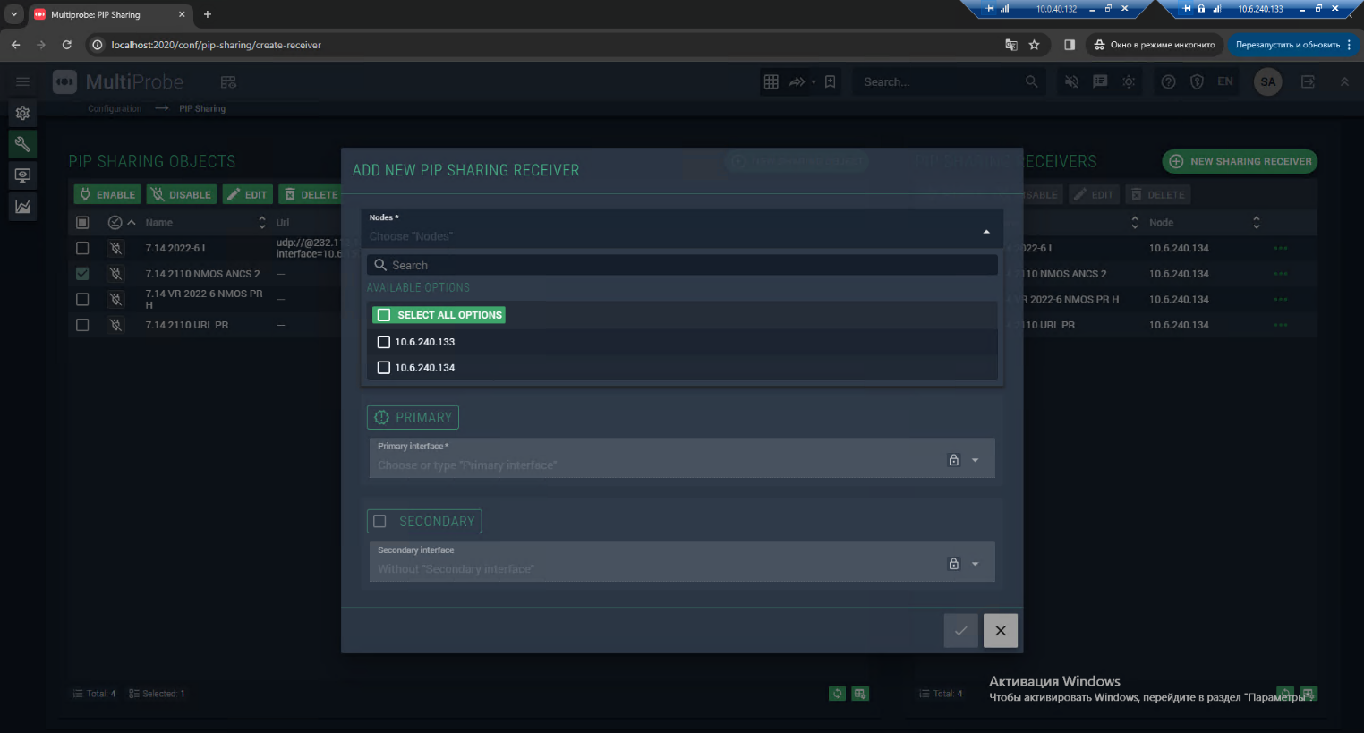 - Nodes — a dropdown list of nodes where the receiver will be created. Multiple nodes can be selected. Required. If a node that was used when creating the source PIP Sharing object is selected, the system will display a warning that this selection is not allowed (Figure 182).