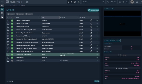 Layouts are used when you need to display summarized information about a monitoring object on a dedicated screen (browser window). They are visualization templates linked to a specific object type — for example, a transport stream or a device — and provide a quick overview of an element's status when an alarm situation arises.