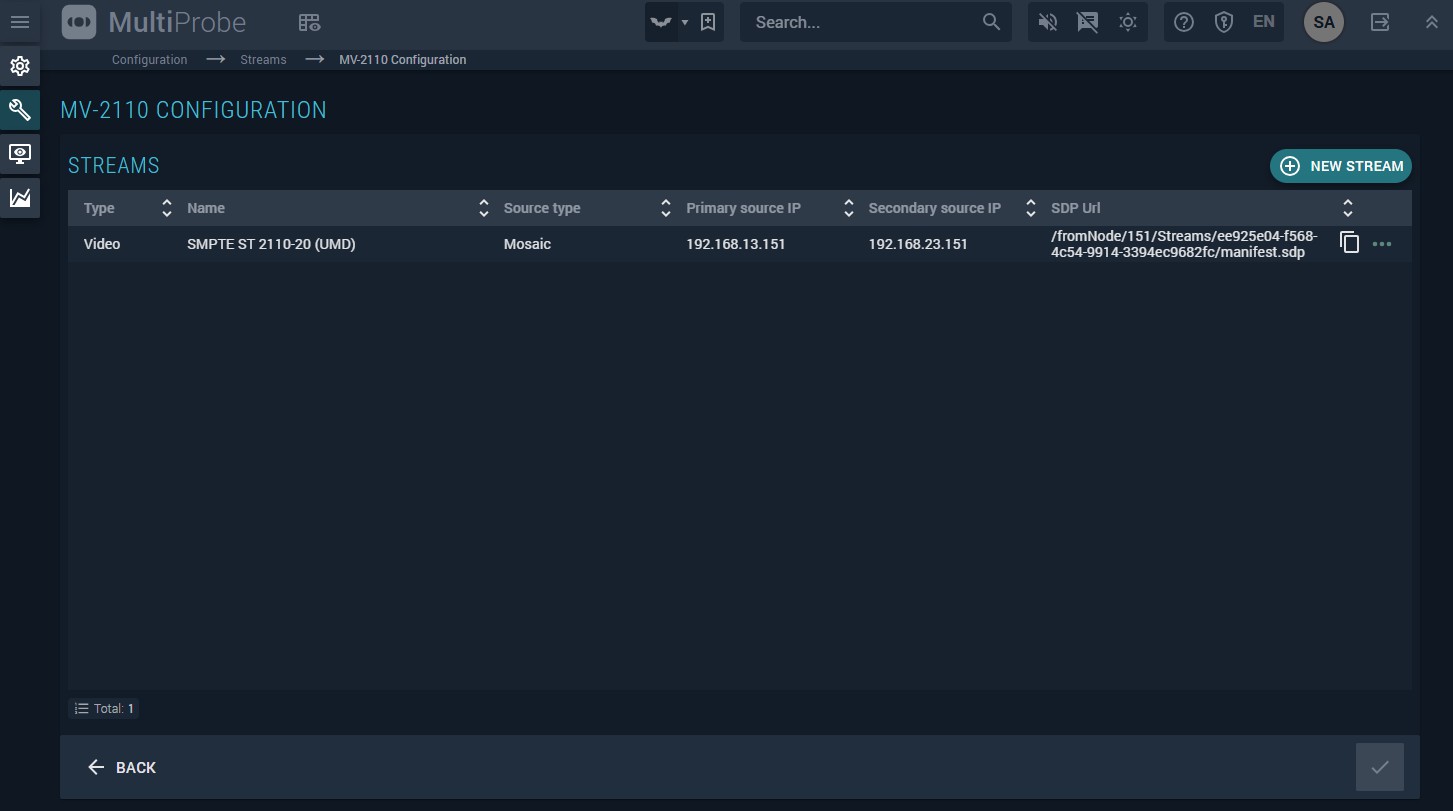 - SDP URL — the URL for retrieving the SMPTE ST 2110 stream description in SDP format (Session Description Protocol, RFC 8866).