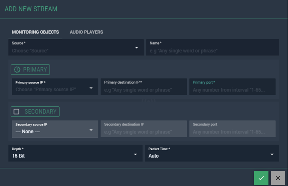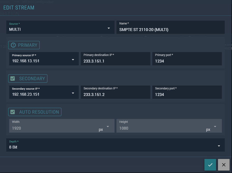 - Secondary source IP — the network interface IP of the node for the secondary stream.