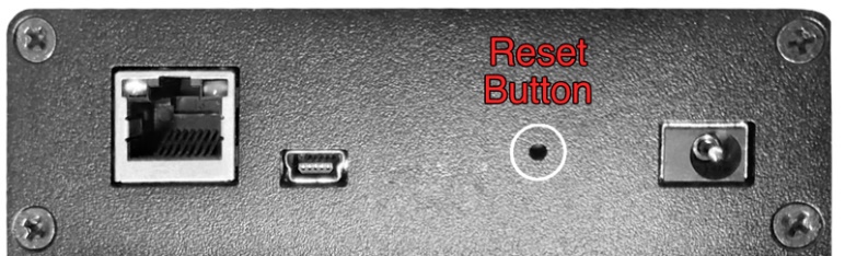 If you lose access to the device — for example after setting an incorrect IP address — you can restore the factory default network settings using the physical reset button.