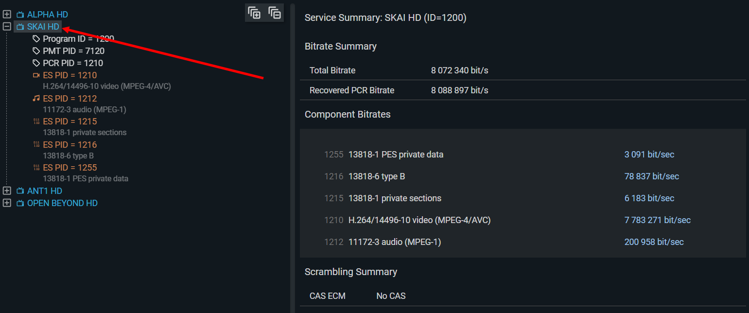 | Service bitrate | Combined bitrate of all component PIDs for a single service. Constant in CBR services, variable in VBR or stat-mux. |