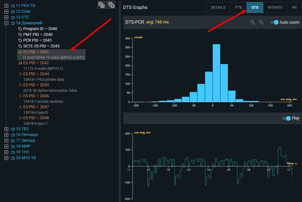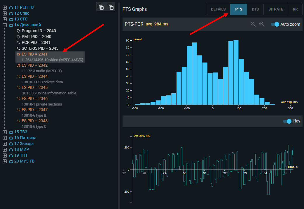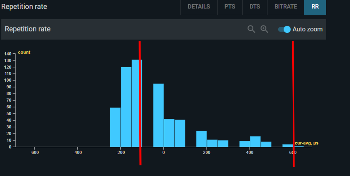 TS Analyzer compares the measured PTS (and DTS where present) against the expected value calculated from the PCR, and displays the deviation as a histogram and timeline graph. The zero on this graph represents the average offset (shown in the panel title); individual deviations are shown relative to that average.