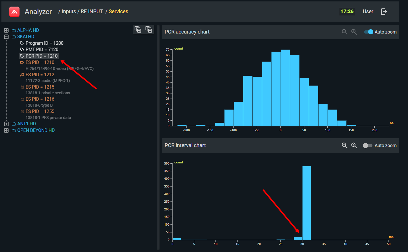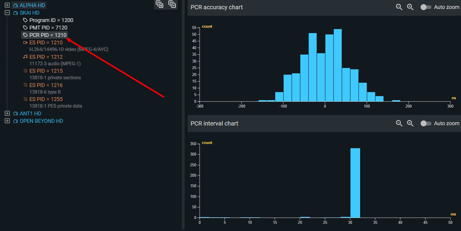 Note that PCR accuracy relates to the service's overall bitrate (including stuffing for that service), not to the bitrate of individual components. A service can have variable-bitrate video and audio, yet maintain a constant overall bitrate through stuffing in the elementary stream headers — and the PCR histogram will reflect that constant bitrate.