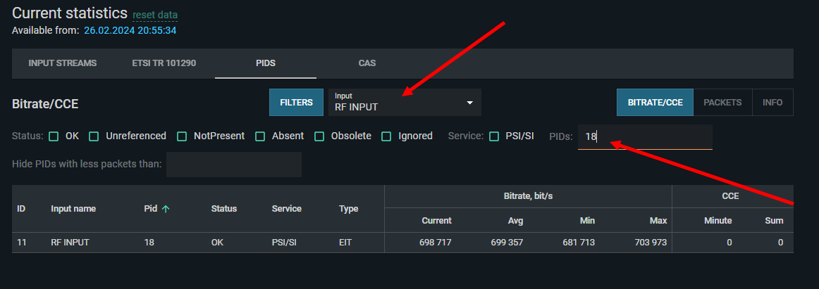 Or check the bitrate on the PID statistics screen with a filter for PID 18 (0x12):
