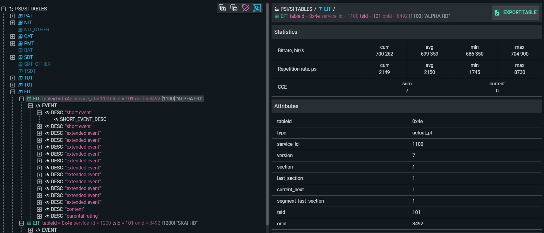 - EIT_actual (table_id 0x4E and 0x50–0x6F) — EPG for services in the current TS.