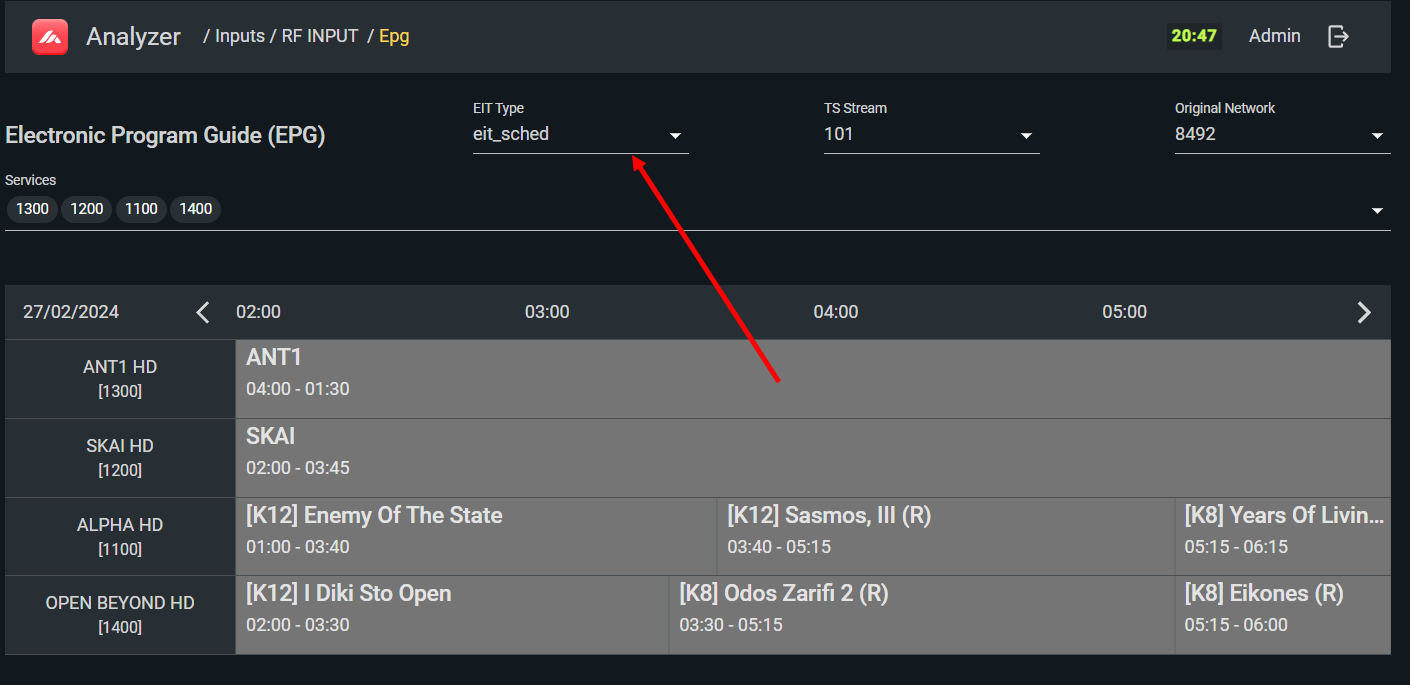 EIT tables are large and generate significant bitrate (potentially 1 Mbps or more). Operators often increase the EIT transmission interval to conserve bandwidth. Verify EIT timing on the PSI/SI screen: