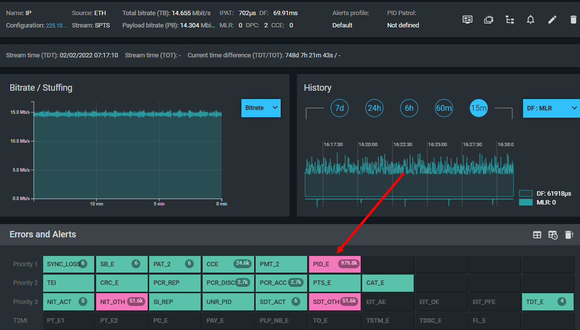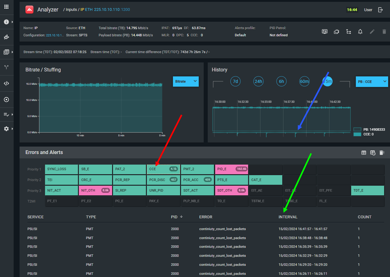 | Periodic CCE on all PIDs | Looped playout, insufficient receiver/transmitter buffer, periodic RF interference, network jitter | Check RF for interference; check buffer sizes; analyze DF in MDI |