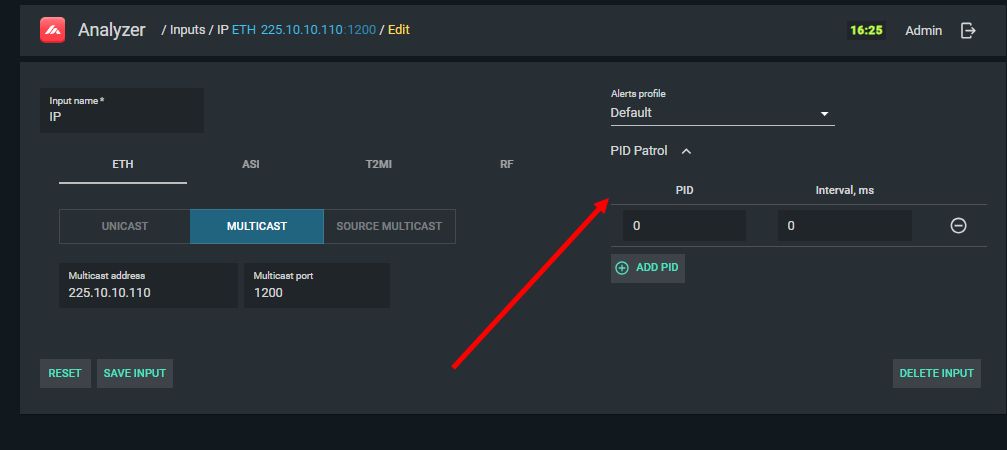 Open the input configuration panel and locate the PID Patrol section. Specify: