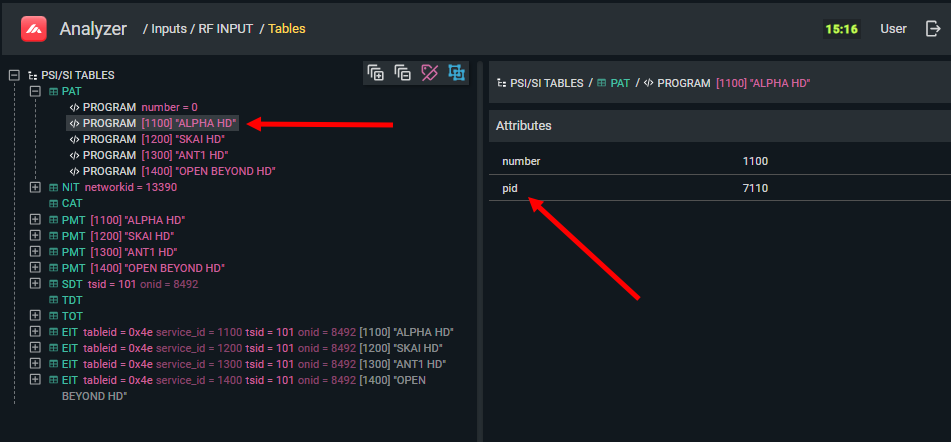 To verify which PID carries the PMT for a specific service, open the PSI/SI screen, navigate to PAT, and select the service name. The PID is shown in the Attributes panel on the right: