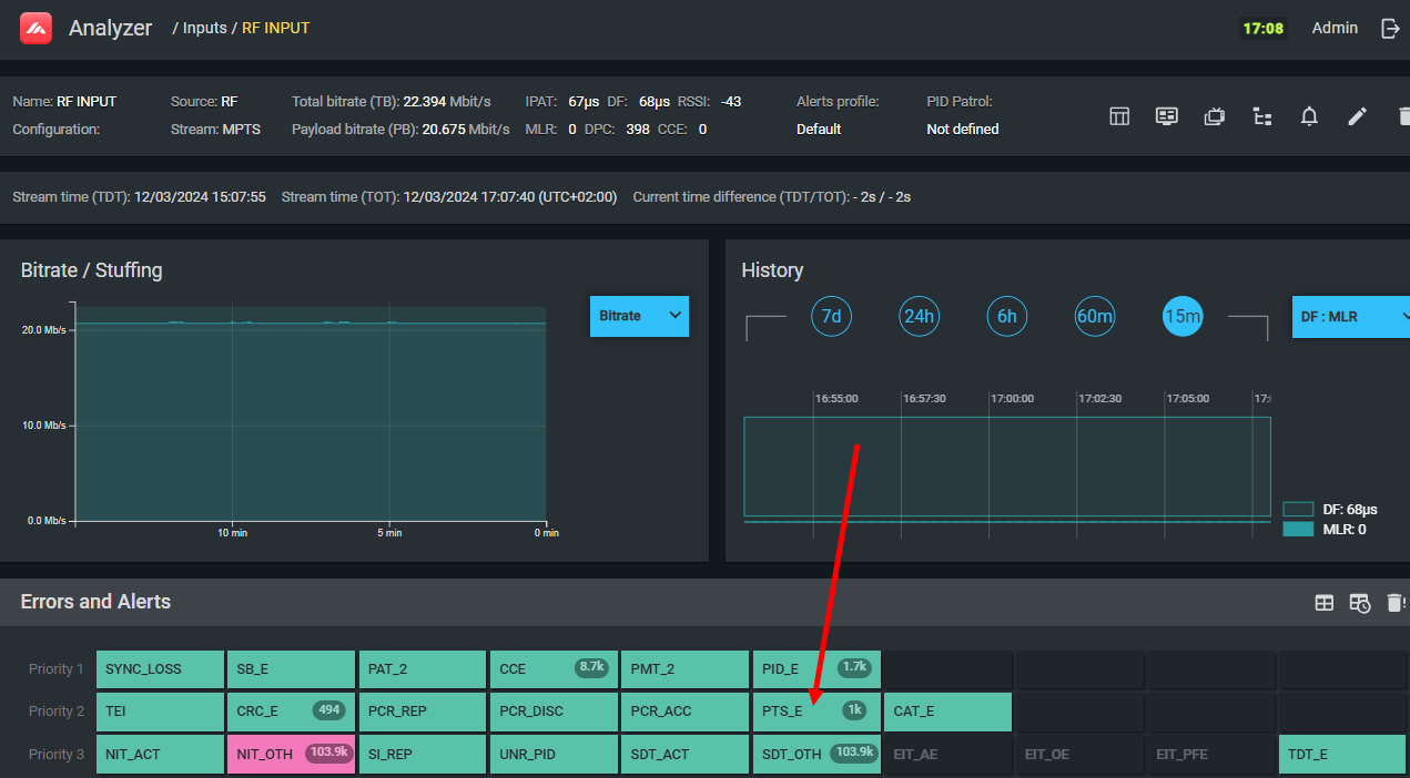 PTS timestamps are absent from an unscrambled elementary stream, or are arriving less frequently than once every 700 ms. This error checks only the presence of PTS, not its correctness — for content accuracy, see Bitrates & Timestamps.