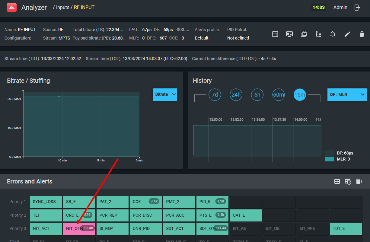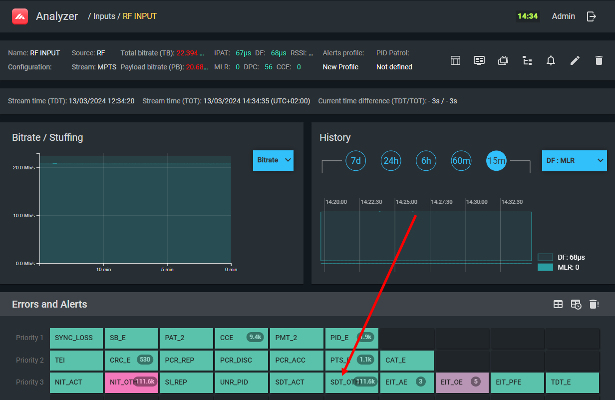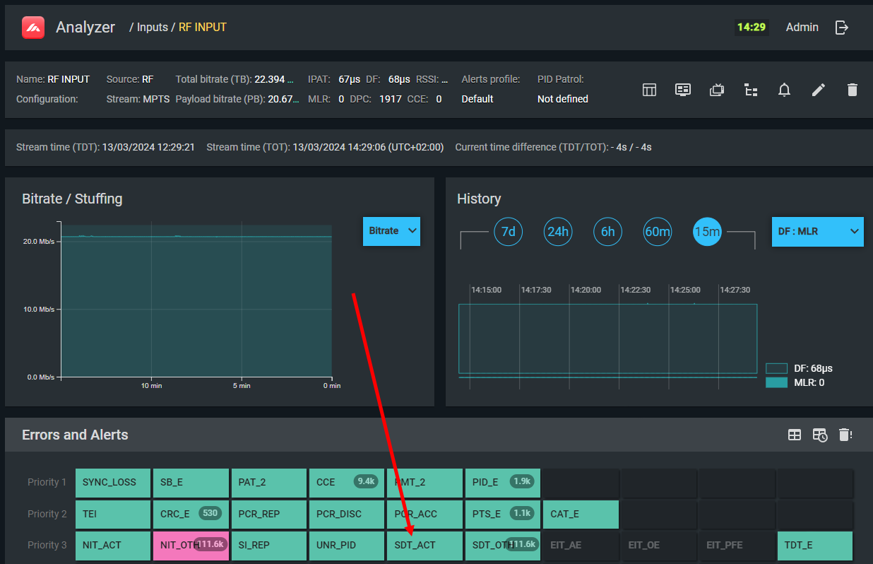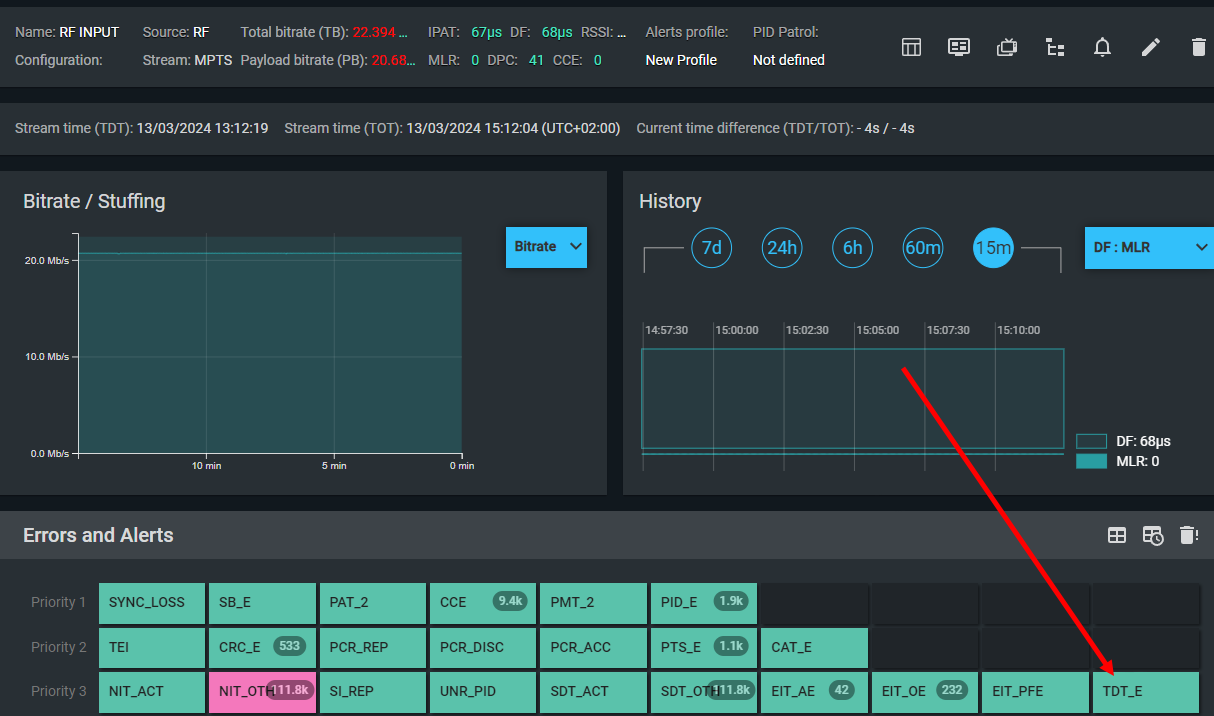 The TDT table (UTC time information) on PID 20 (0x14) is absent, arriving too infrequently (more than 30 s), too frequently (less than 25 ms), or PID 14 contains unexpected table_ids.