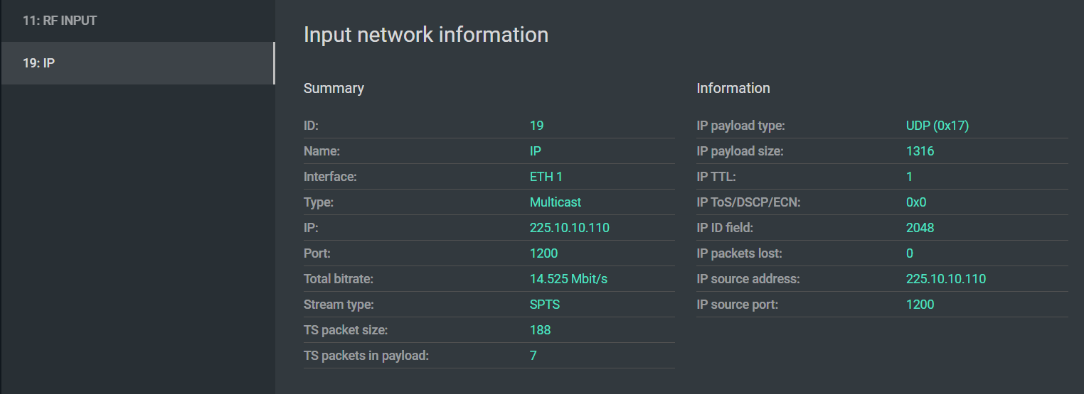 The IP input information panel provides a summary of the incoming UDP/RTP stream that is useful both for verifying correct configuration and for diagnosing transport problems.