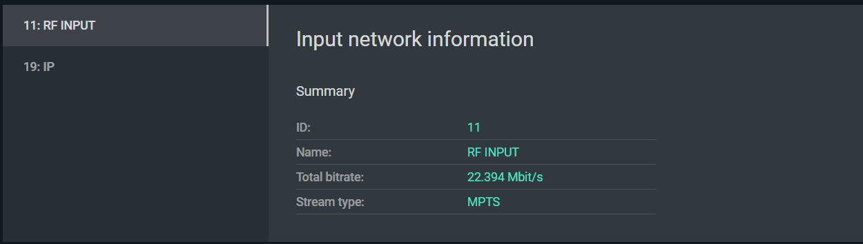 For detailed RF quality analysis — signal level, SNR, BER, and DVB-T2 modulation parameters — use the dedicated RF monitoring screen described in RF Signal Monitoring.