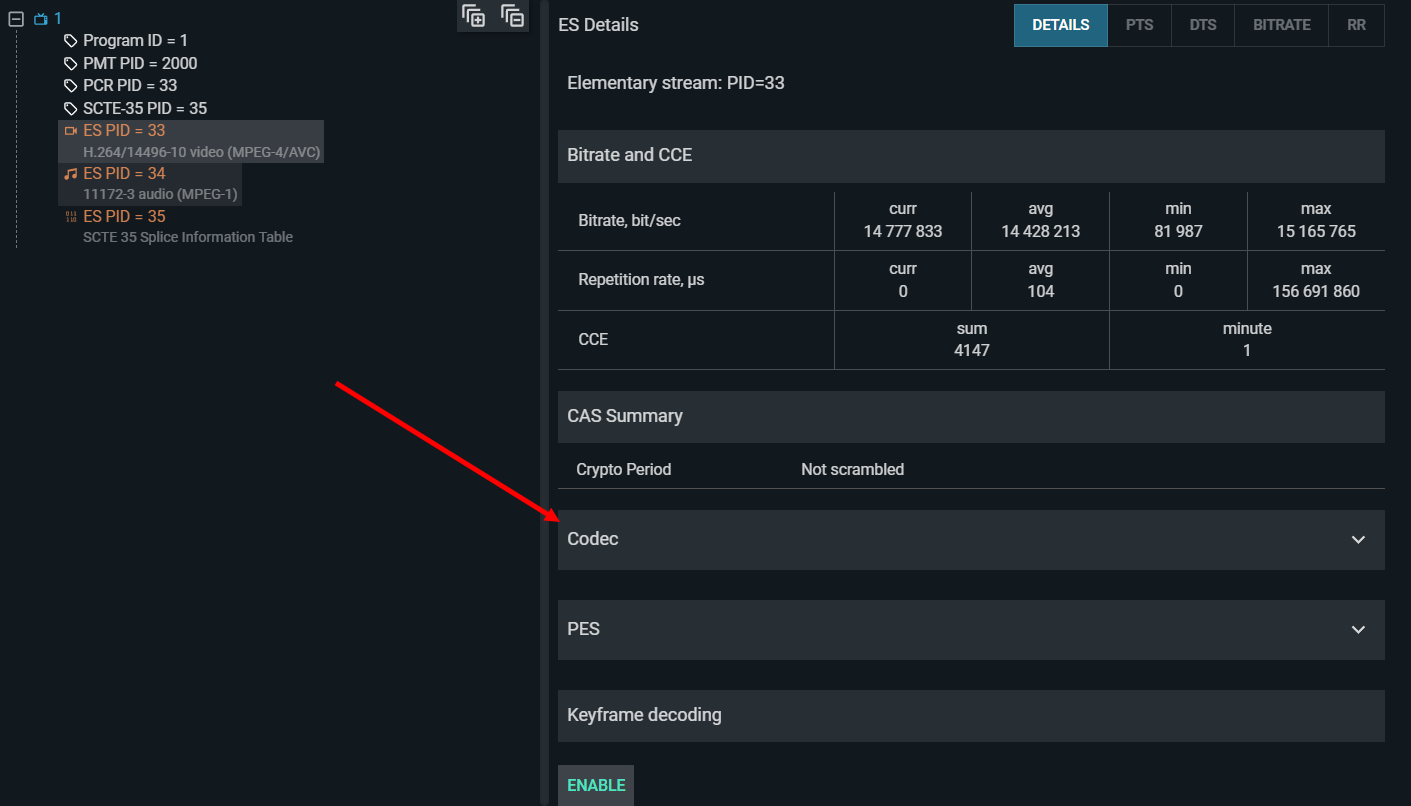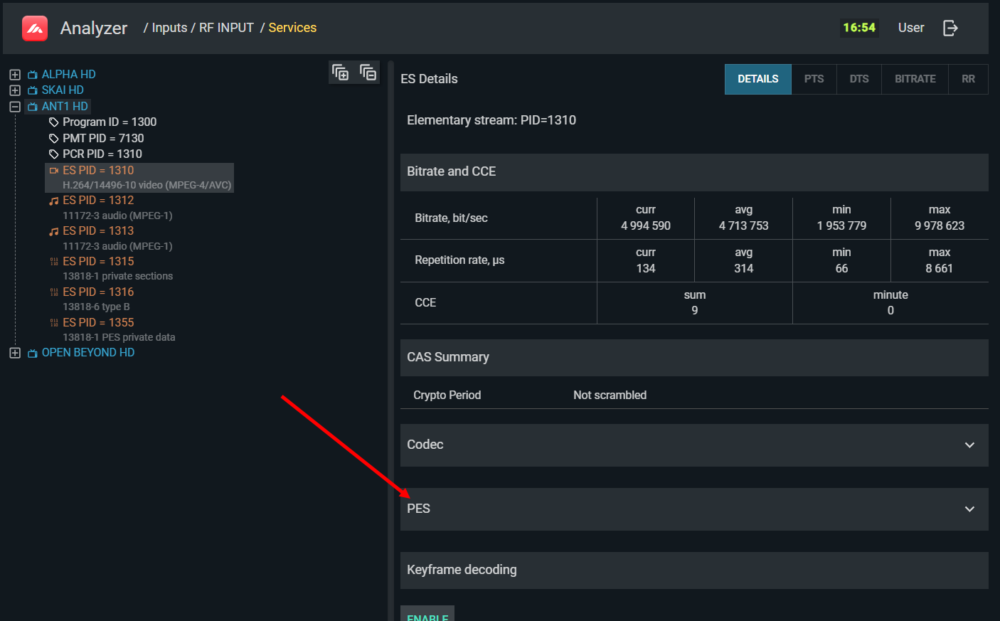 Navigate to the service's elementary stream in the service tree and select the PES tab to view header fields. The position of the PES section in the interface: